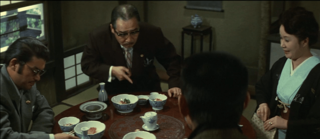 The attention to detail carries into the filming methods. The famous Fukasaku “shaky camera” used in action scenes highlights the messiness of killing done by men who are professionals only by name: missed opportunities, lethal pausing, endless bullets missing the mark or hitting the wrong target, panicked yelling and rolling on the floor – professional hitmen they are not. But the camera also shines in the quiet moments. As is fitting of an ensemble cast film, characters are rarely alone in the frame, and even then are not always in clear view with props or other characters in the way. Using eye or shoulder-level shots, Fukasaku puts us in the room with the characters – and this proximity is not innocent. An incredible amount of detail is gleaned from watching all the characters: the subtle glances exchanged in the background, the expressions washing over a character’s face, the strange activities and actions they do away from the center of the screen. Battles Without Honor and Humanity is a show-not-tell film that seems to endlessly reward pausing and rewatches.