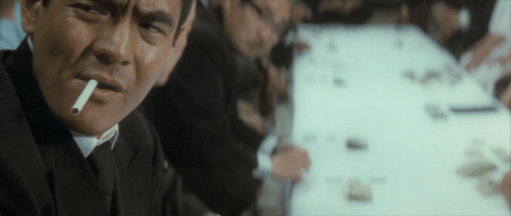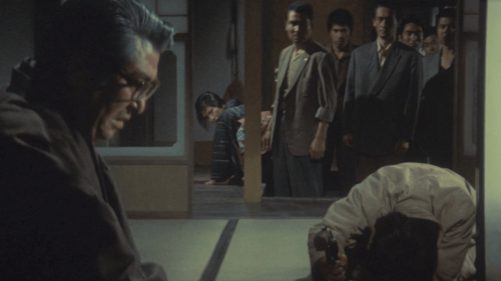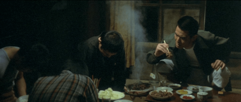 Deadly Fight in Hiroshima continues on with the hallmark Fukasaku touches – whirlwind pace and character introductions / dismissals, shaky camera, and neat chapters charting each character’s journey. Additionally, the second episode’s narrowed focus grants actors more space to fully express their character’s emotions and personality, with the help of numerous long takes and close-ups. Time ticks slowly as we watch Yamanaka hesitate to make his first kill, sweat streaming down his face and hands shaking uncontrollably. The deed done, we pause to watch him closely once more, terror abruptly giving way to glee, twisting his face into a strange grimace as he whistles a dark military song in celebration. The same opportunities are given to side characters: Muraoka’s flash of naked terror as he’s caught short without a plan, before quickly regaining composure; Matsunaga’s uncontrolled (and uncharacteristic) outburst of frustration, as he’s faced with the consequences of his duplicitous actions.