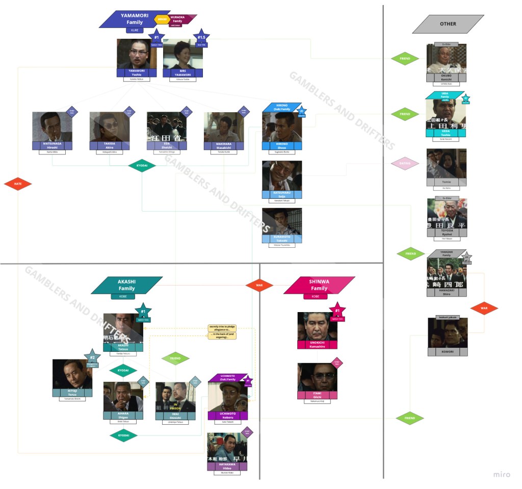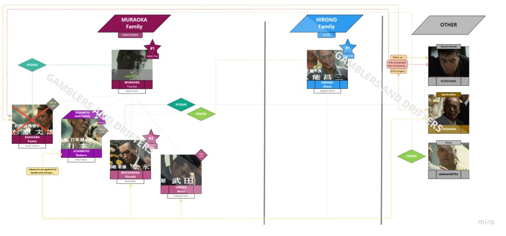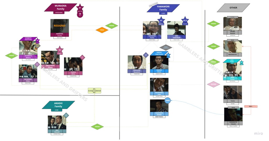 In response, in June 1961, Hirono makes good on his promise to Uchimoto and takes him to the Akashi family in Kobe to organise kyōdai bonds between the two – a clear and deliberate slight back from Hirono, who understands he has no future with Yamamori. They meet Akashi Tatsuo, head of the Akashi family, his kyōdai and underboss Aihara Akashi, and his Captain Miyaji Teruo – and Uchimoto gets his wish, becoming Aihara‘s kyōdai and building strong ties with the Kobe contingent.