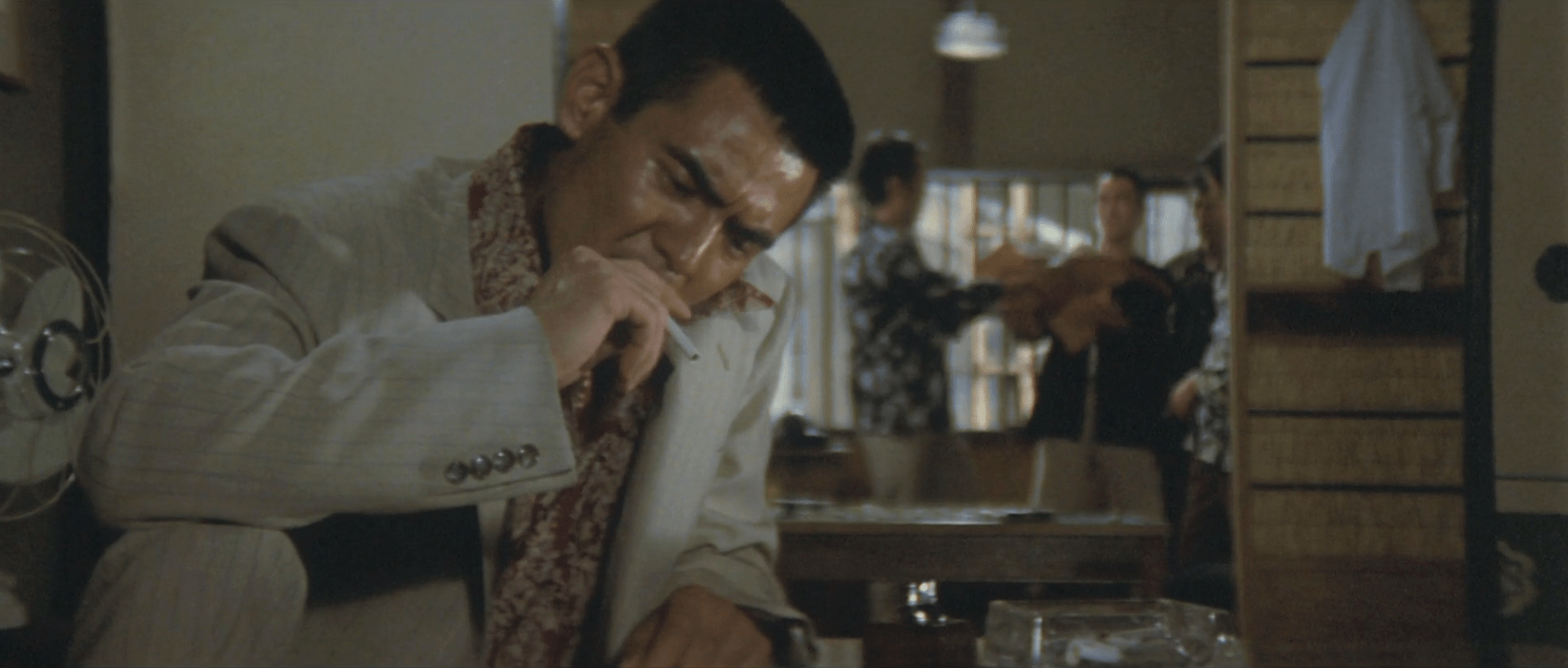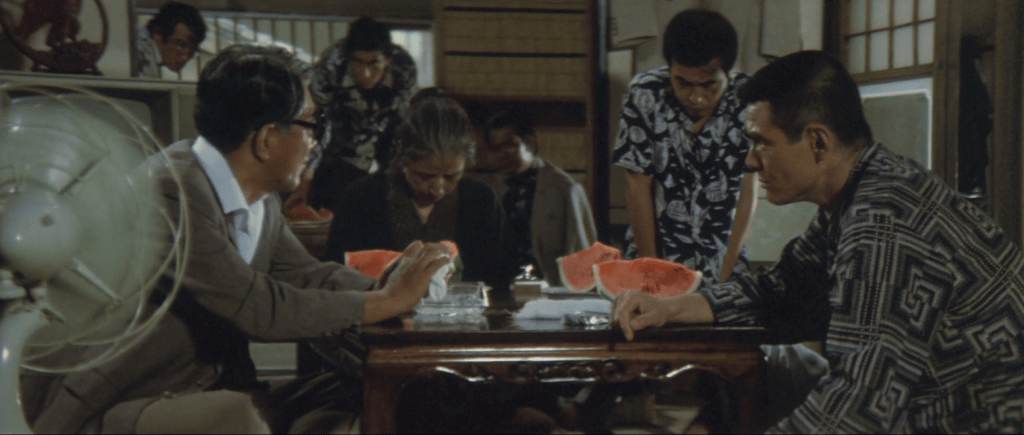 Back in Kure, Hirono has other issues to deal with. His dim underling Katsuharu Saijo has stolen money from the family in order to buy a TV for his girlfriend, which earns him a brutal beating from Hirono. Hirono is barely done when his friend Ueda Toshio arrives, making light of the situation and telling Hirono that he has been summoned by yakuza elder Okubo Kenichi, who has also gathered Hirono‘s parole officer and guarantor.