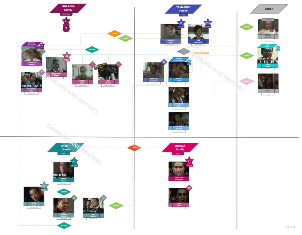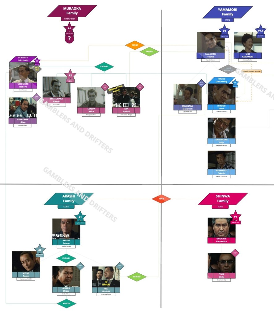 Run Time: 34:57 to | Key Families: YAMAMORI – HIRONO (Sub-YAMAMORI) – AKASHI – UCHIMOTO (Sub-AKASHI) – UEDA – SHINWA – OTHER | Reference Chart (spoilers): see previous section.