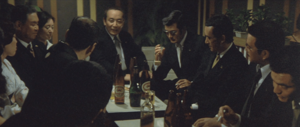 The ceremony over, Yamamori celebrates at a local bar with his underbosses Makihara, Hirono, Eda, Matsunaga, and Takeda – along with ceremony guests from Kobe Aihara and Miyaji. Yamamori delights in bragging about owning Hiroshima, adding that now the family didn’t need to cosy up with outsiders – a direct reference to Uchimoto‘s contested links with the Akashi family, and making things awkward for said Akashi outsiders Aihara and Miyaji. Called out by Hirono, but not done impressing the Kobe contingent, he then proceeds to brag about his family’s great money-making underbosses, pointing to them one by one with Takeda as the top earner – and, of course, skipping Hirono.