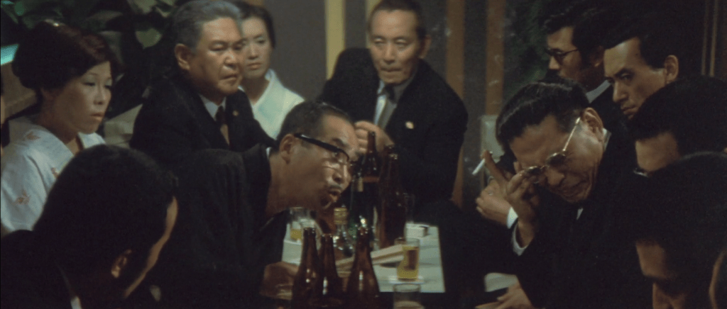 What unfolds is an intensely embarrassing and dramatic scene, fit for a Shakespearean play. Uchimoto greets the table politely, only to get immediately smacked down verbally by Yamamori, drunk on power and intent on kicking Uchimoto (the big loser of the Muraoka succession war after all) when he’s down with zero remorse. Blow after blow, insult after insult, mocking Uchimoto‘s failure to succeed Muraoka, mocking his status as a yakuza, baby talking to him – Yamamori punches and punches as everyone around the table melts with embarrassment, eventually reducing a distressed and cornered Uchimoto to tears.