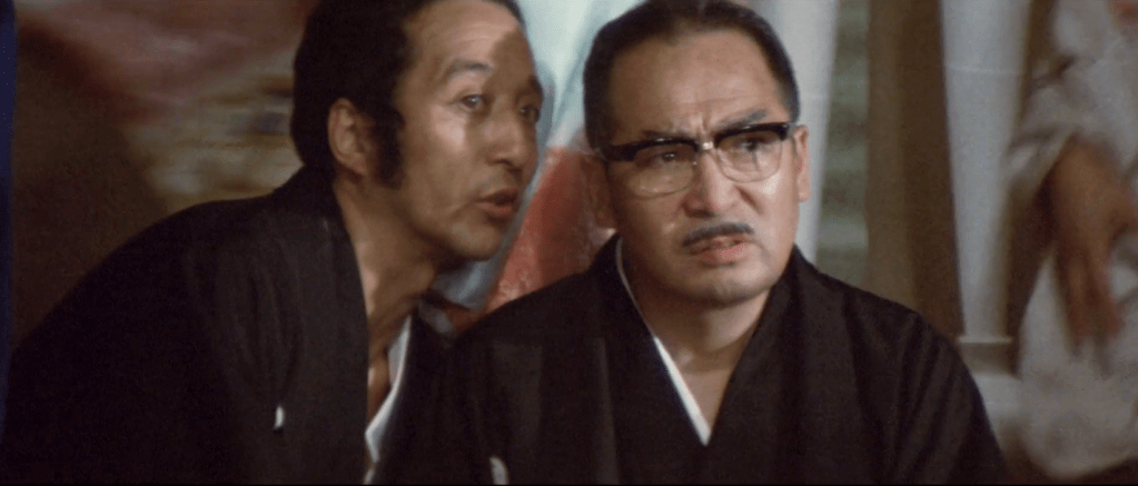 But the men still have important business to discuss. As Yamamori gallivants with geisha, and with Makihara the snitch peeking from afar, Takeda approaches Hirono to ask him to get his acquaintance Toyoda to officiate the new alliance. But Hirono and Matsunaga attempt to discourage Takeda, loudly commenting on the sorry state of the Yamamori family, not fit for an alliance and still courting two-bit players from rival families like Hayakawa (indeed, as Matsunaga notes, all the geisha are from Hayakawa‘s club).