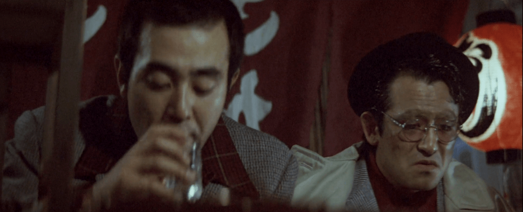Meanwhile, in a calmer part of town, Hirono is toasting his friend’s Iwai‘s release on bail around a nice meal and sake. Iwai asks Hirono if the rumour is true: will the Yamamori form an alliance with Shinwa, as Takeda wishes? Hirono confirms, and reminds Iwai that he’s unable to affect this situation, not being in the good graces of the Yamamori family. Iwai suggests that Hirono then reconciles with Uchimoto, in order to allow for the Akashi to maintain some influence in Hiroshima.