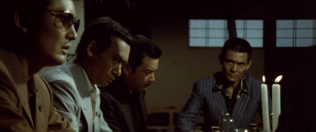 Dimly lit by candlelight, a maudlin good cop Aihara takes over the conversation: the disagreements between Uchimoto and Yamamori stemmed from old, external family struggles which are now behind them; and Uchimoto did cut a finger in apology; can’t the Yamamori men let this go and finally allow peace for everyone (strategy #3)? Takeda retorts that the group has already apologised to Uchimoto, and that the matter should already be settled. Bad cop Miyaji continues on: yes, the Yamamori apologised, but the finger incident has not been appropriatingly addressed. Therefore, for the Akashi, nothing less than reconciliating and restoring their kyōdai bond with Uchimoto will do to avoid completely severing ties with the Yamamori (strategy #4) – but, as Takeda points out, this is the very thing they cannot do (Uchimoto being an enemy of the Shinwa).