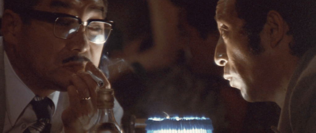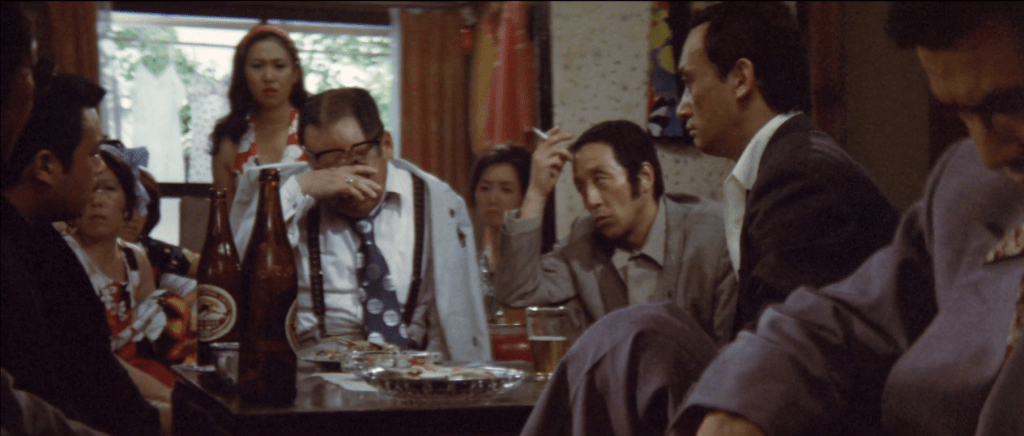Back in Hiroshima, Makihara goes straight to Yamamori to tell him of the mutiny. But Yamamori is not worried. As he paws an extremely disinterested hostess, his little spy the bar’s mama (owner), who happens to be Hayakawa‘s wife, joins the party and tells them that her husband is not so loyal to Uchimoto – and could be turned if needed. Right on cue, Hayakawa arrives at the bar – and is quickly beckoned by Yamamori…
