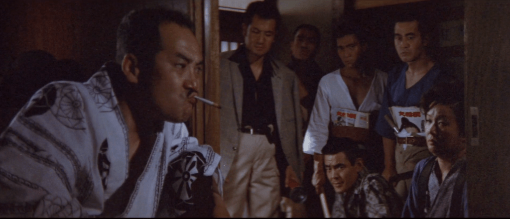 Kuramoto makes up his mind, determined to make a stand for his boss and saviour. But another person overheard the conversation: Katsuharu, who promptly phones benefactor Makihara to let him know that Kuramoto is coming to kill him, before stating very loudly that he is leaving for Tokyo. Betrayed by his very family, Kuramoto gets to the cinema only to be brutally shot down by Makihara men, aware of his purpose.