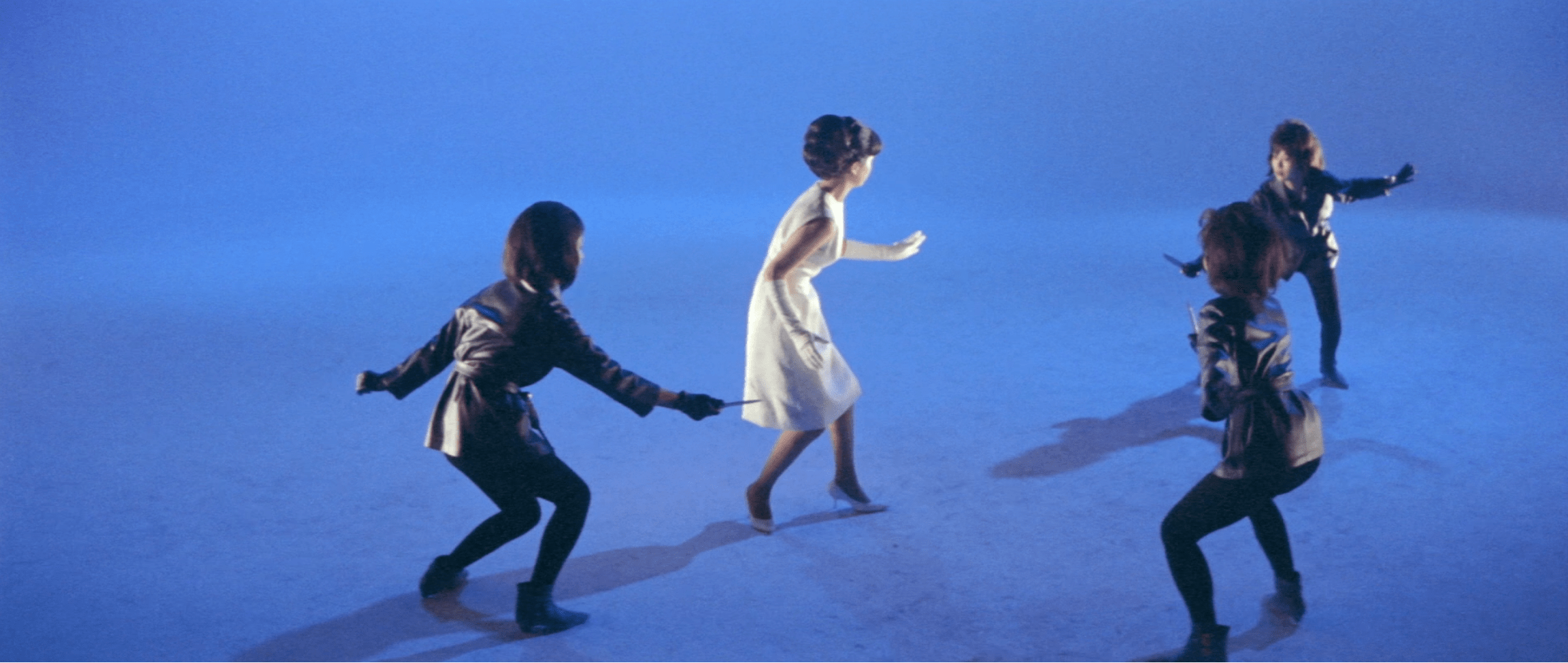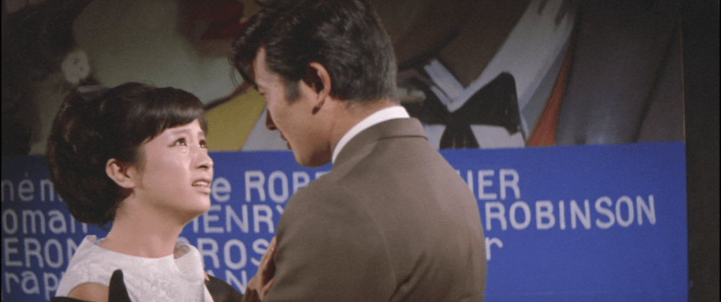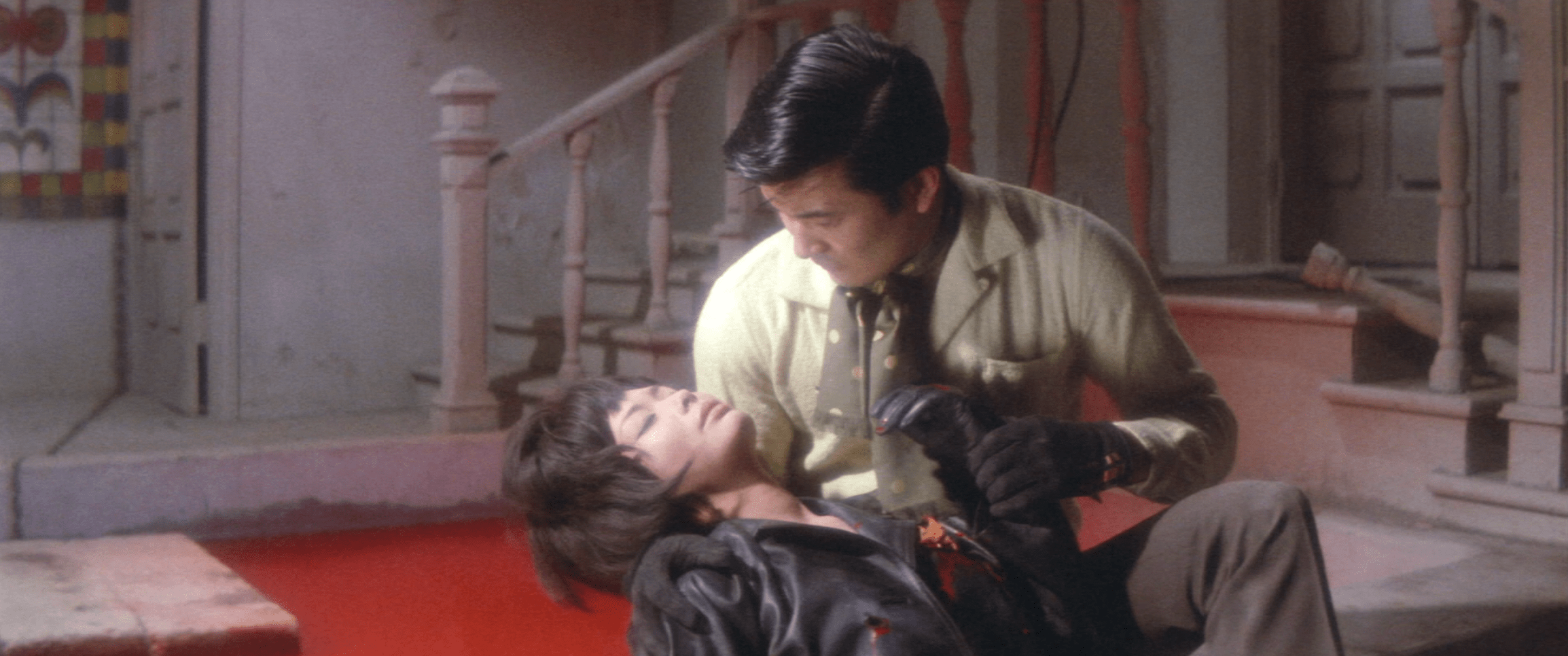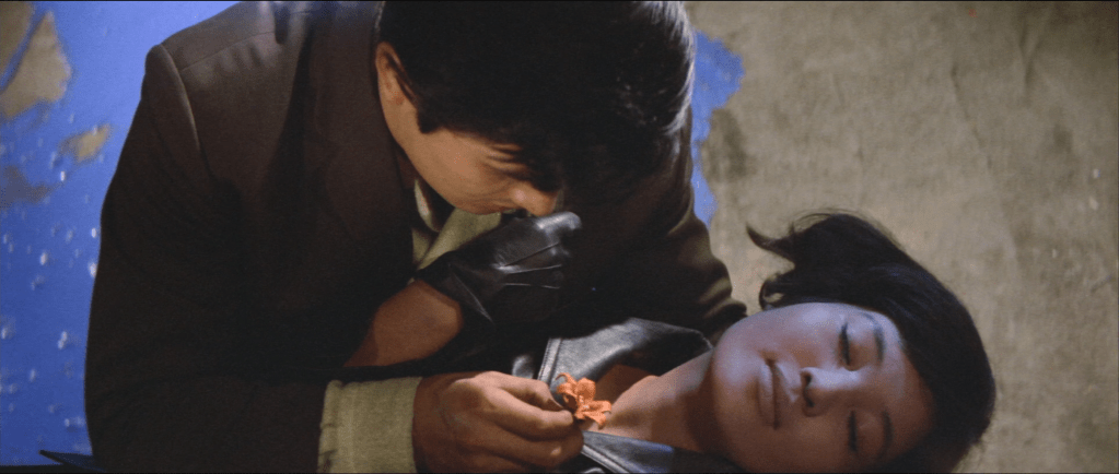 A gangster finally cuts the sprayer’s cord but Hondo continues the fight, kicking down a gun about to shoot Akiko and fighting to save her from the gangsters – unaware that Sabu is about to throw a knife at his back. But Harue sees – and, repaying Hondo’s favour to Akiko, throws herself in the way of the knife… receiving a fatal wound. Hondo rushes to Harue, and she breathes her last breath in Hondo’s arms, telling him she wishes she had been on his side earlier, as blue paint (her colour) flows behind the two. Hondo, distraught once again, collects her lily pin.