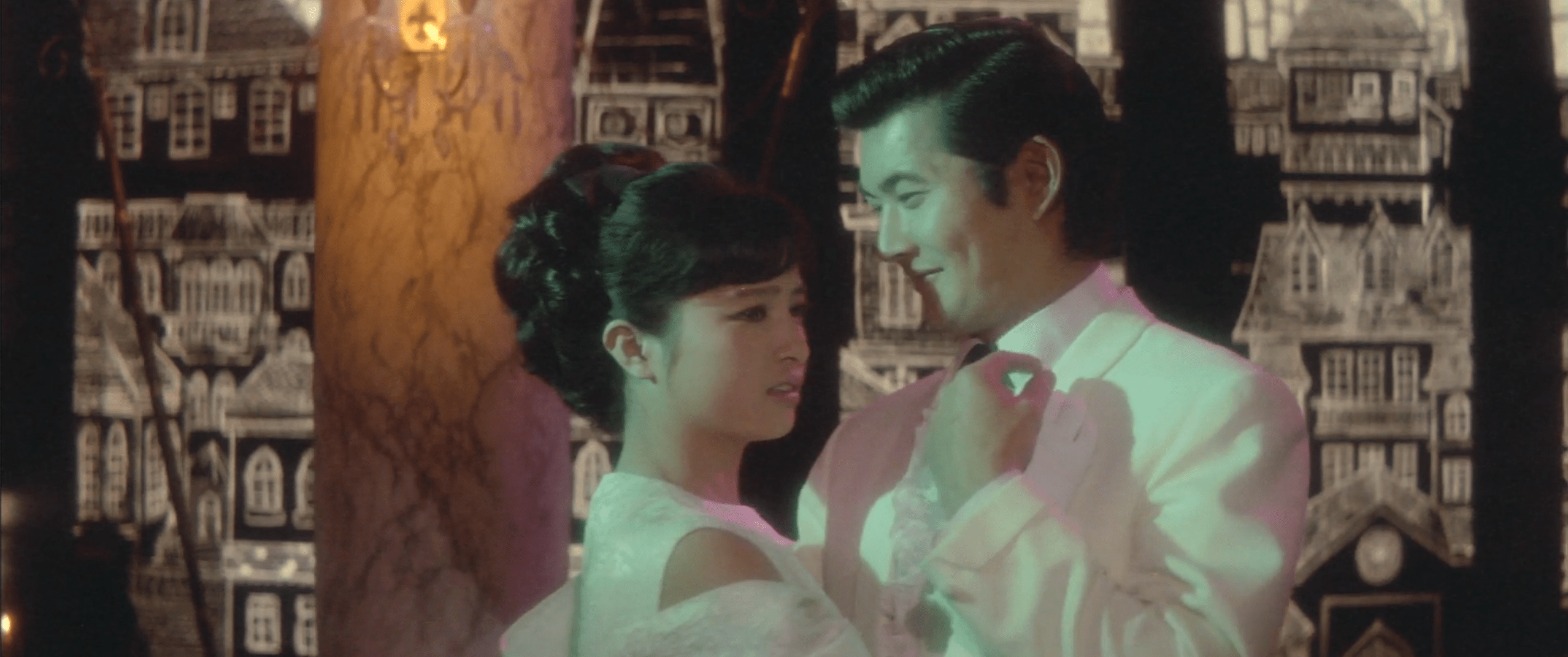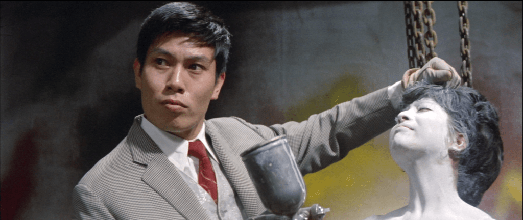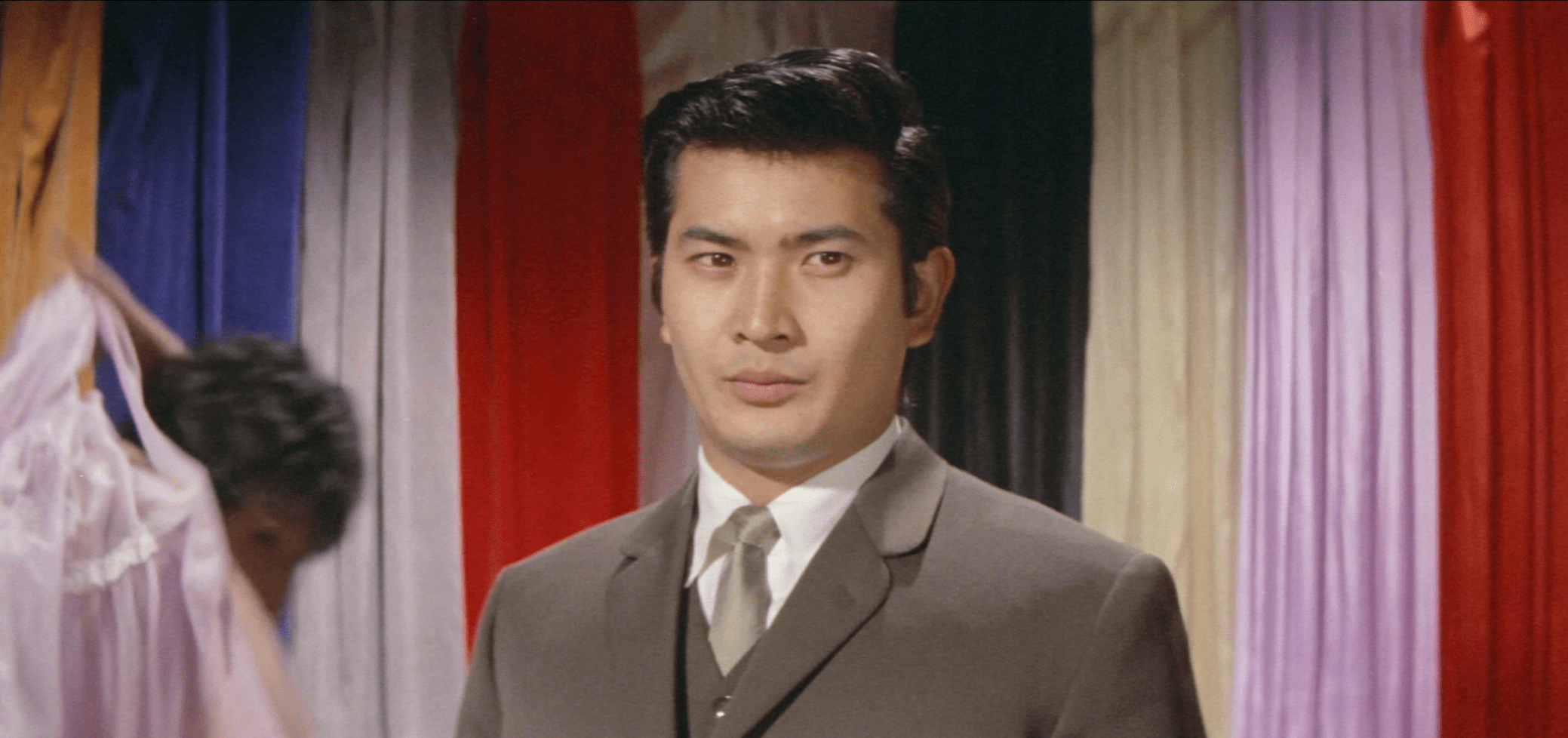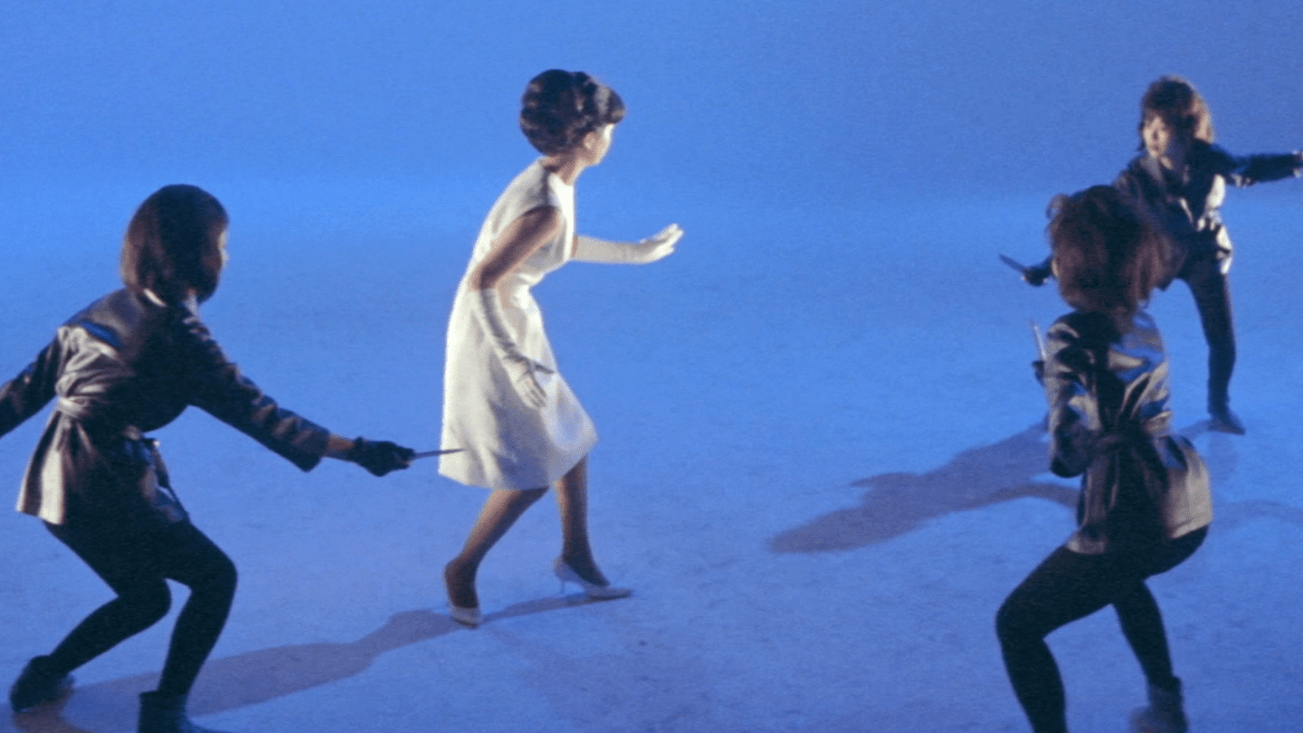 A gangster finally cuts the sprayer’s cord but Hondo continues the fight, kicking down a gun about to shoot Akiko and fighting to save her from the gangsters – unaware that Sabu is about to throw a knife at his back. But Harue sees – and, repaying Hondo’s favour to Akiko, throws herself in the way of the knife… receiving a fatal wound. Hondo rushes to Harue, and she breathes her last breath in Hondo’s arms, telling him she wishes she had been on his side earlier, as blue paint (her colour) flows behind the two. Hondo, distraught once again, collects her lily pin.
