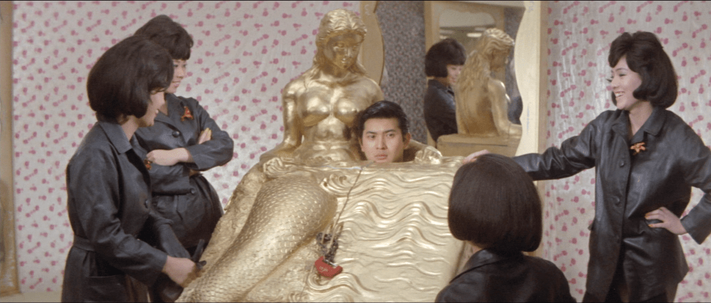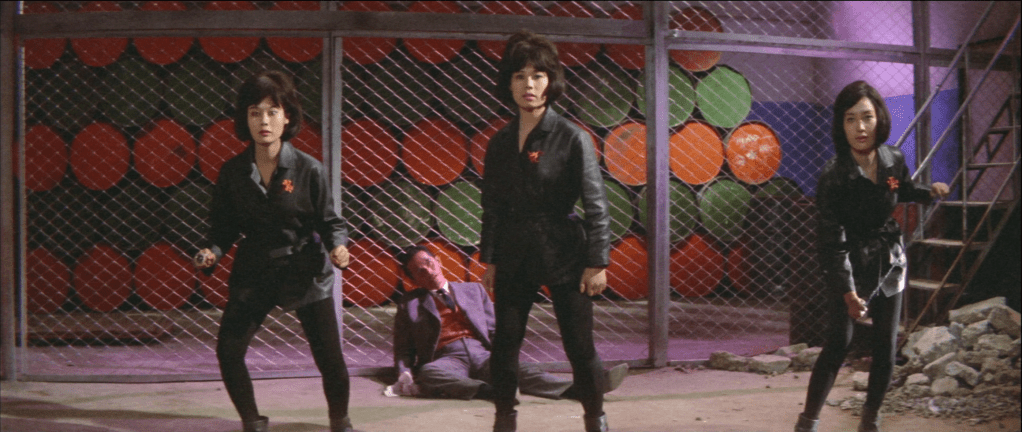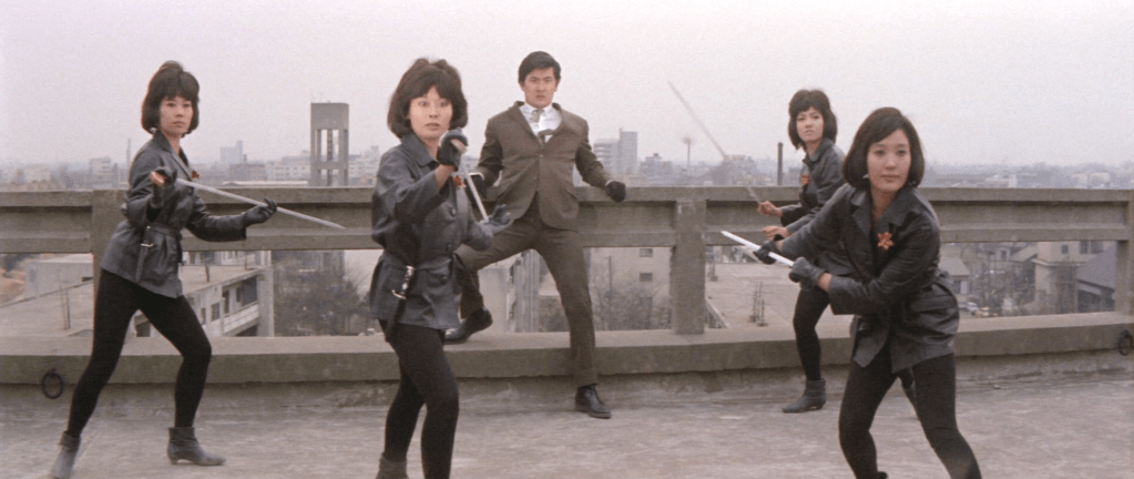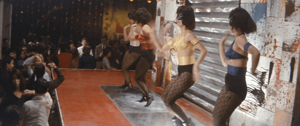 Some time later, Hondo is tied up in the car in a basement, watched by Natsuko. Music fills the room via a near-by air vent: above them is a club where… the Black Tight Killers (Akiko, Harue, Yoshie, and Kikue) are performing a gig as gogo dancers!
