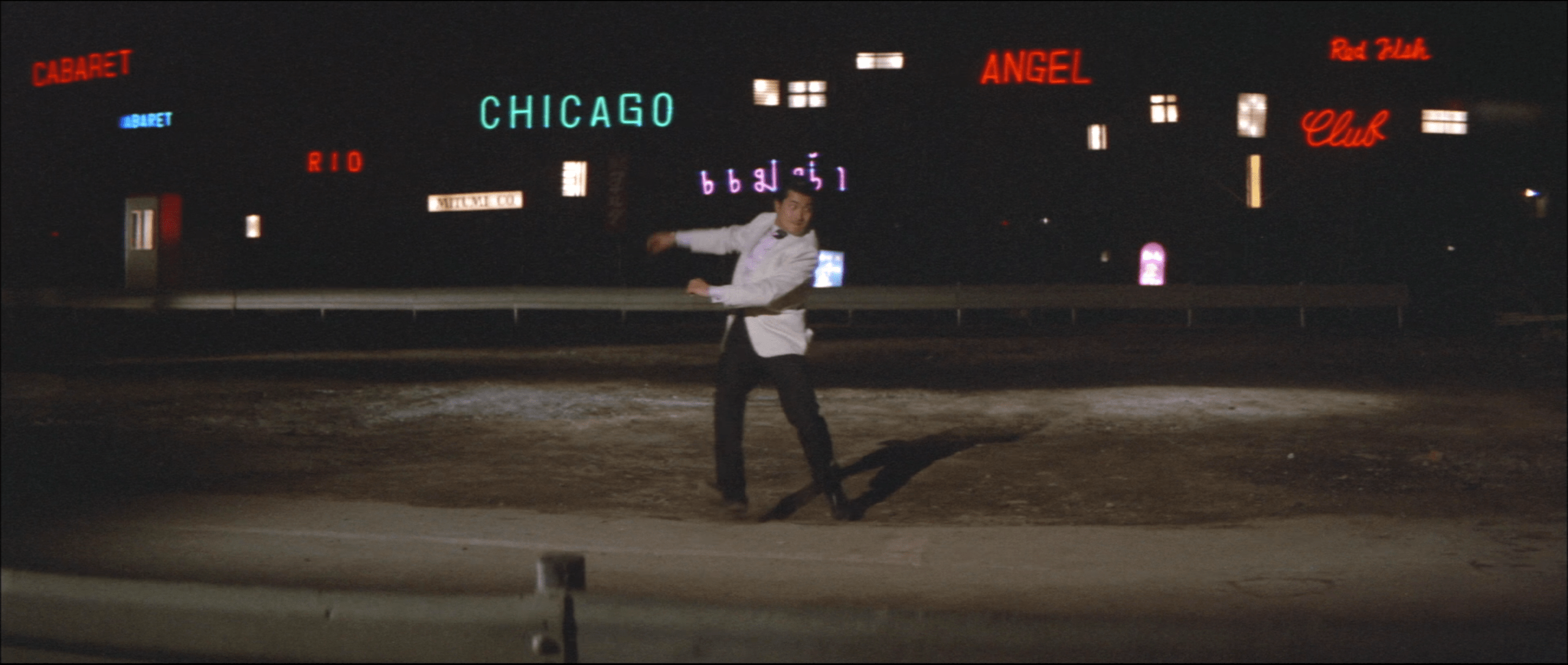 At a phone booth, Hondo is busy reporting the murder to the police when he’s interrupted by yet another scream from Yoriko who, left outside the booth, is now being kidnapped by the Black Tight Killers! Against a backdrop of beautiful neon, Hondo gives chase and manages to grab the car – only to be violently shaken off and left behind. The Black Tight Killers have won this fight.