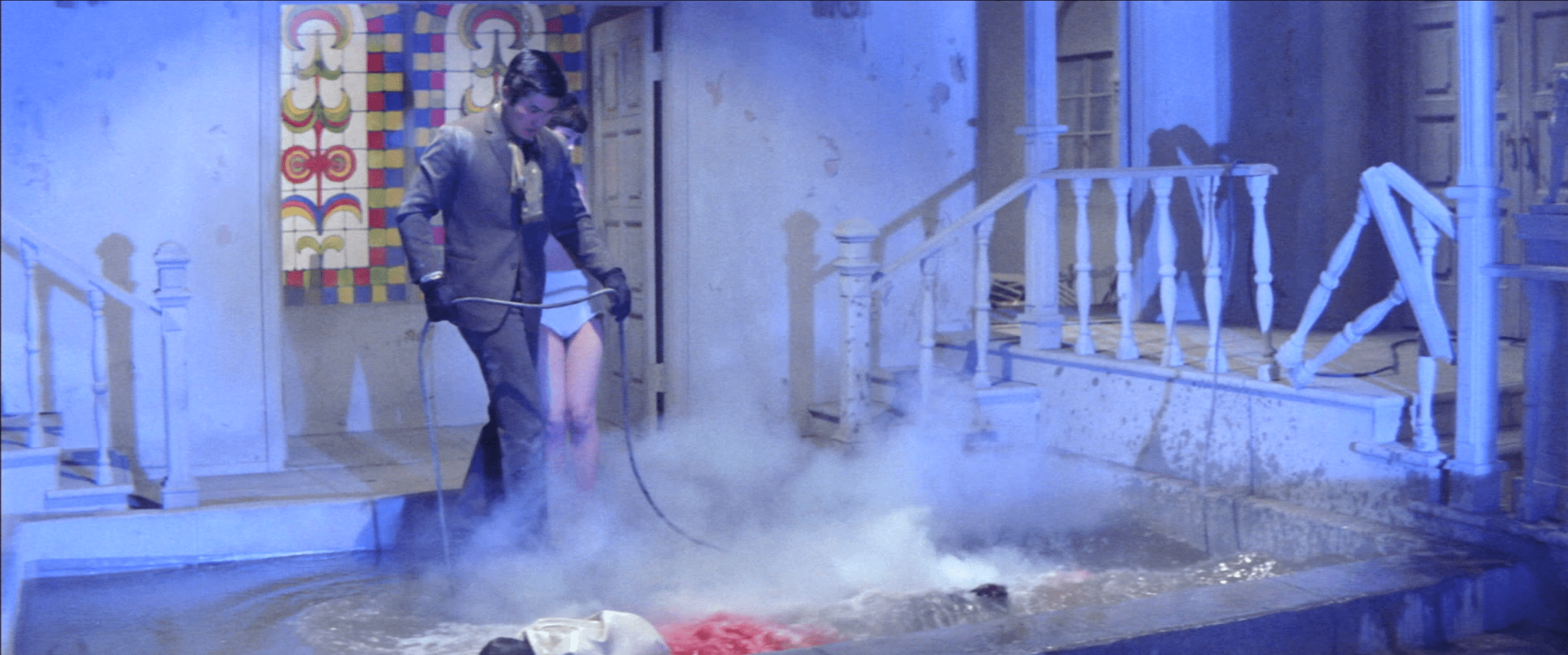 The pair finally arrive at the villa – which is oddly calm and silent. Hondo goes in, and is presented with yet another shocking spectacle: Yoriko attached to a pole (as usual), perched on a platform above a pool of water and connected to an electrocution machine. Before Hondo can make a move, a voice is heard welcoming him: it’s the foreigners gang, threatening to electrocute Yoriko if he makes another move.