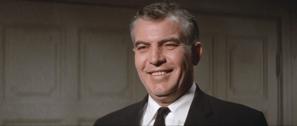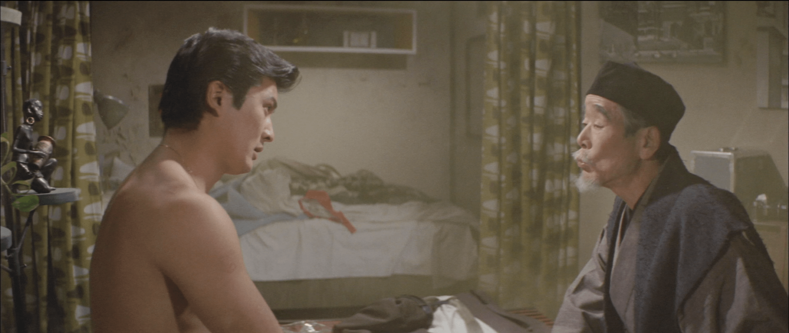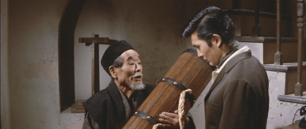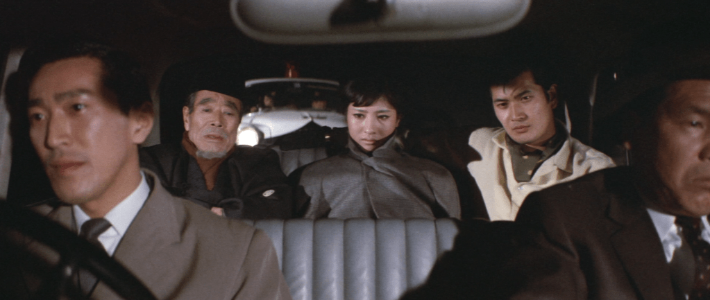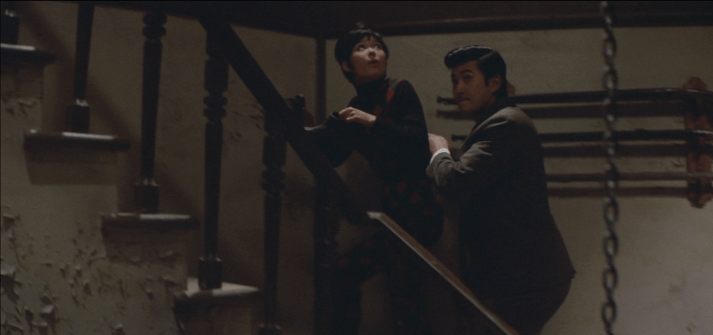 As Hondo and Kikue run out towards the stairs, a gangster shoots Kikue, wounding her and triggering her to fall down the stairs. On the ground floor, Hondo and Akiko reach her, alarmed, as she struggles to maintain consciousness (but still find the energy to modestly cover her chest with her hands – priorities). They carry her to Akiko‘s car where, looking up at Hondo, Kikue expresses happiness at the fact that they made friends before it was too late, before passing away. “She was a nice woman” says Hondo once more, lost for words, as Akiko drives off.