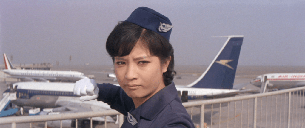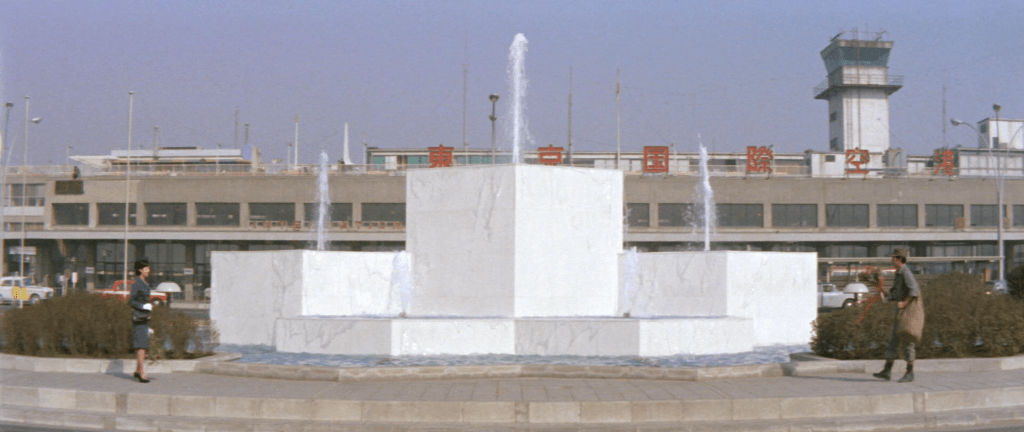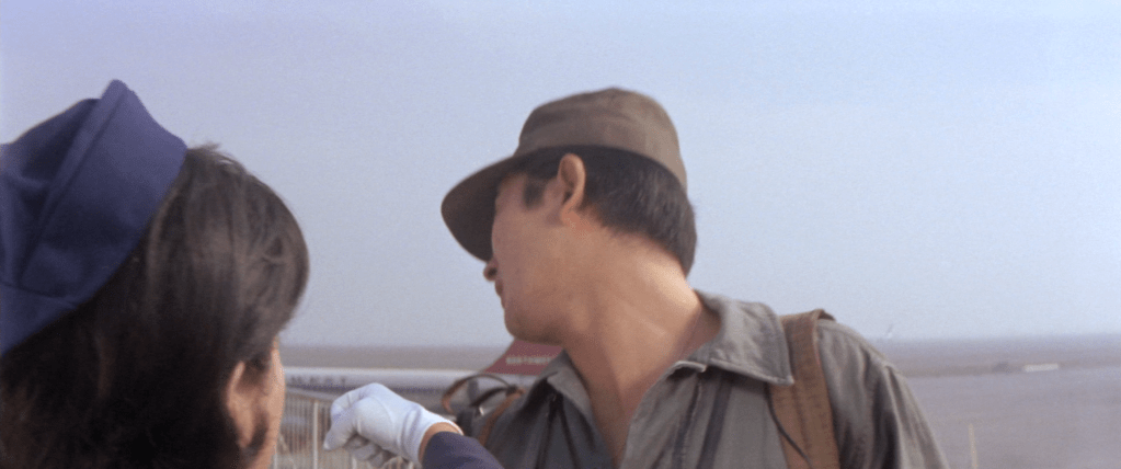 At the airport, the arrival has not gone unnoticed: a group of suspicious foreigners note the arrival, and dispatch one of theirs to follow Yoriko. Near-by, and blissfully unaware, Hondo quickly catches-up with Yoriko, and after several awkward chat-up lines insists to take her out so he can give her the portraits he took.