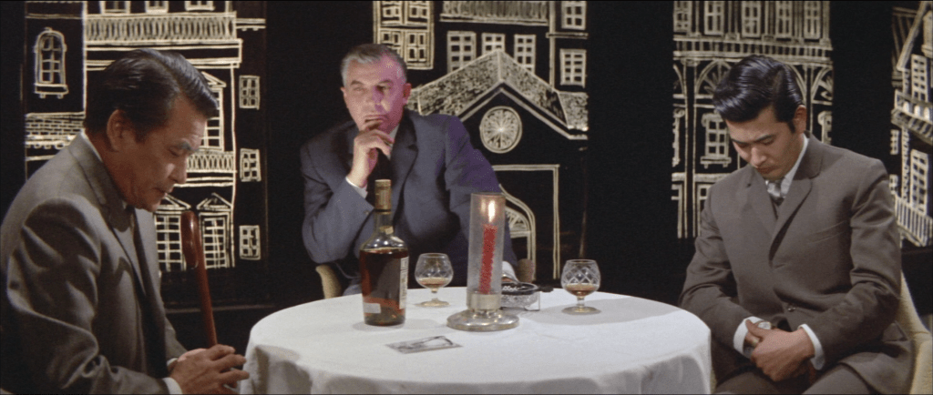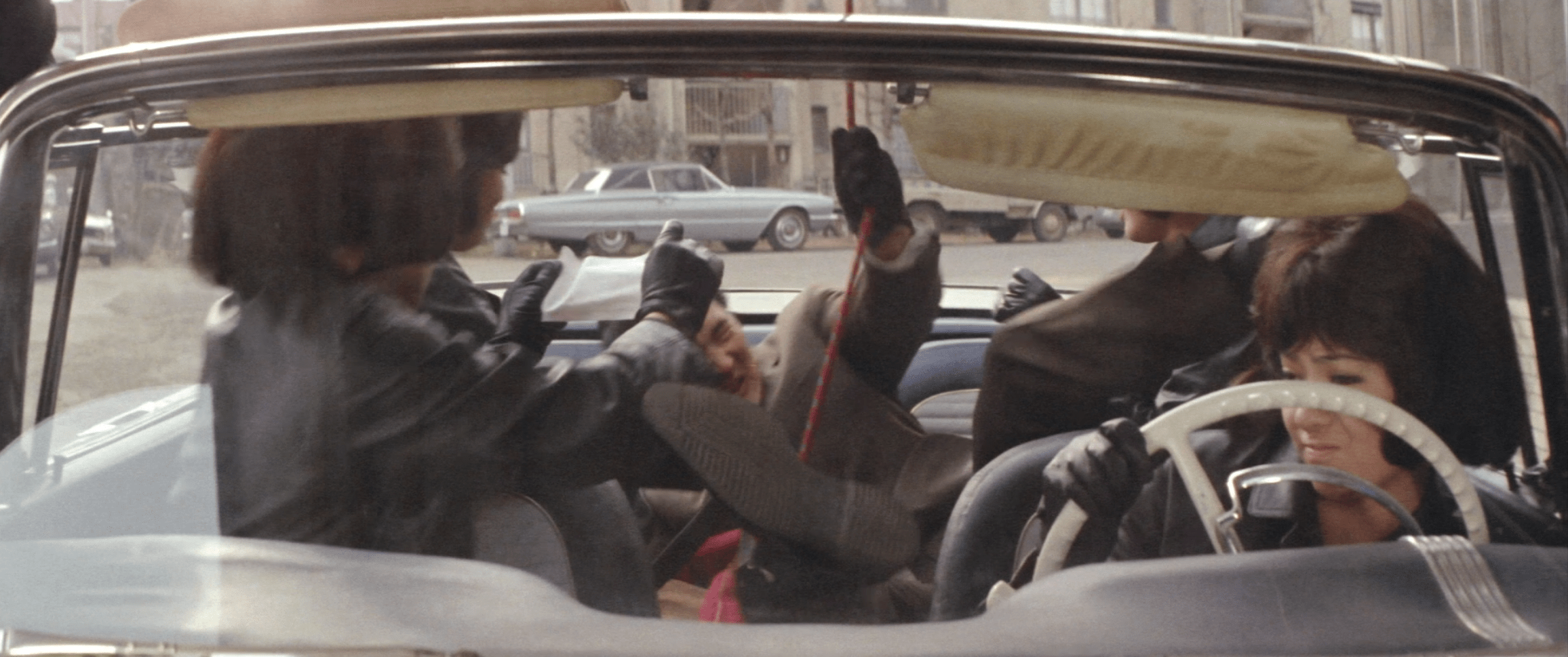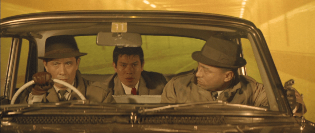 In the car, Hondo remarks that Natsuko is wearing an Okinawa lily, and asks her about its signification and what the Black Tight Killers really want. But before Natsuko can answer, a bullet breaks the rear-view mirror: it’s the trench coat men and Okada thug Sabu, determined to harm Hondo and Natsuko, dynamite and guns in hand.