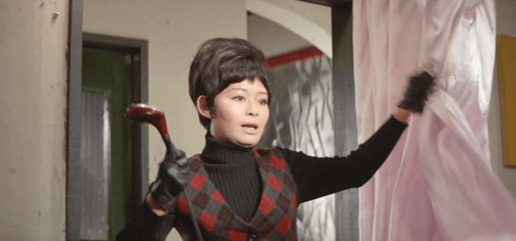 A small silhouette appears within the grey Tokyo skyline: it’s Akiko, practising some powerful golf swings on a rooftop near-by. Hondo is confused, and Kikue tells him to take cover – and soon enough, Akiko‘s golfball-bomb hits true and explodes the gangsters’ office, knocking them all to the floor. Making the most of the situation, Hondo and Kikue attack the gangsters and make their escape, with one of them ripping Kikue‘s top off in anger.