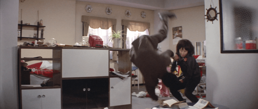 Kikue asks the watcher for a cigarette, promising him intel in return. As the gangster lights her cigarette, Kikue springs into action – spitting it in his face and, ever the judoka, using Hondo to strangle the gangster with her legs. The noise attracts attention from next door, prompting Kikue to pretend to be assaulted, imitating the man’s voice – with Hondo adding in some fake protests for good measure.