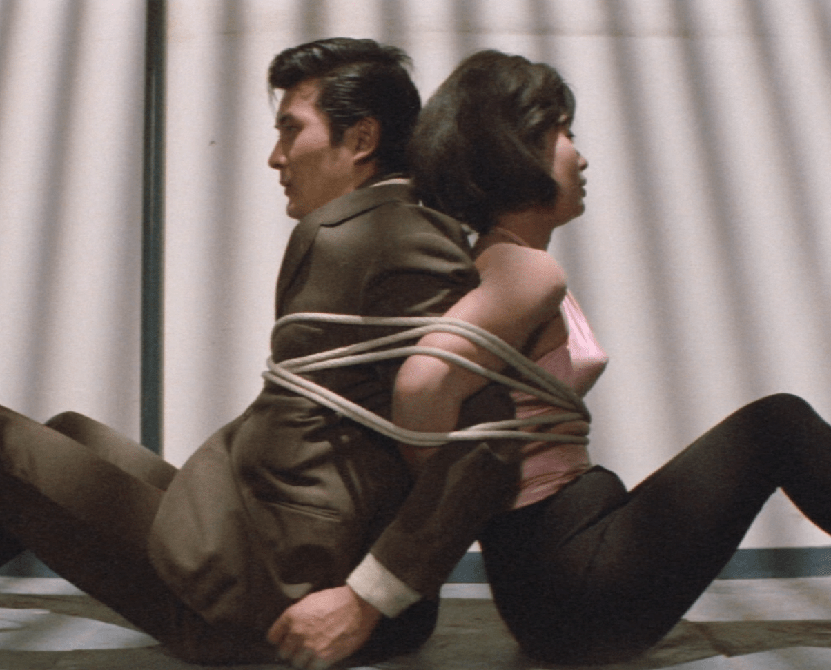 Hondo runs out of the house, only to be ambushed by Okada’s men, who force him into a car at gunpoint. They drive to a faraway warehouse “where gunshots won’t be heard”. As he strolls into the hideout, a dingy garage, Hondo is horrified to find Yoriko within – stripped down to her underblouse and chained to a pole, defenceless. The men are after information on the gold (now worth 100 million yen), and state that if Hondo cannot provide it, then Yoriko will be tortured until someone talks.