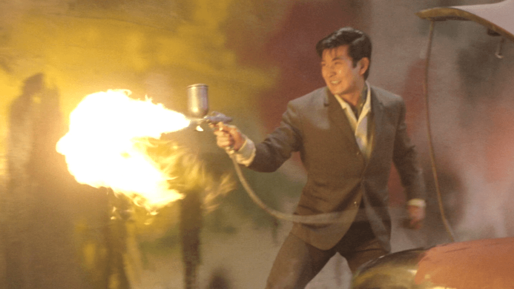 Hondo, after kissing the cannon for good luck (naturally), fires at the helicopter – and it’s a hit! The helicopter explodes, with Hondo bursting into laughter and looking the happiest we’ve seen him the whole film (canons > women).