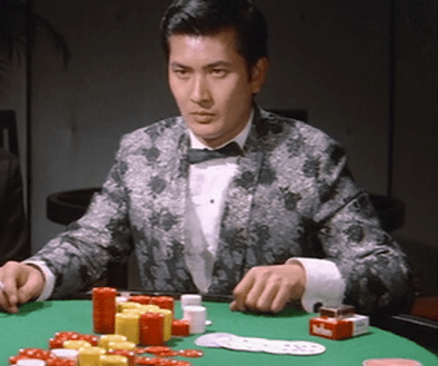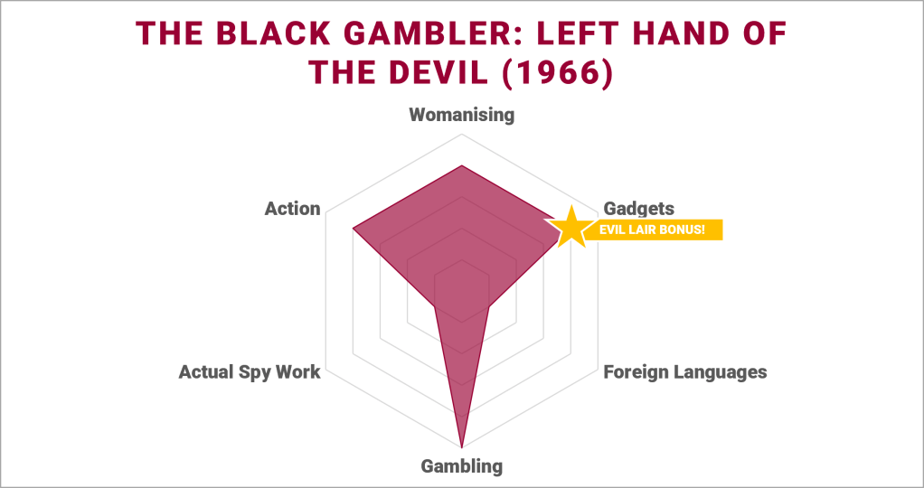 In 1966, Nakahira Kō returned to the Black Gambler series with The Black Gambler: Left Hand of the Devil (1966). Perhaps inspired by the light-hearted Bastards Without Borders (1965), Nakahira discards the serious tone of his previous Black Gambler entry to make this gambling action comedy – complete with epic evil lairs, speedboat chases, and sneaky deadly weapons that fit right into the broader spy genre.